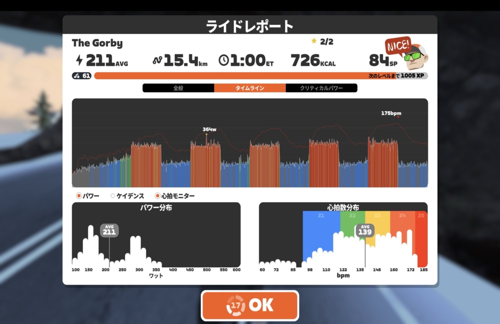 FTPを上げるには、週1くらいでvo2maxのトレーニングを入れると良いとのこと。 というわけで、キツくて有名なワークアウトであるThe Gorbyをやることに。 FTPの110%で5分、レスト5分を5セットというハードメニュー(´・ω・`) vo2maxへの刺激ということで、... -